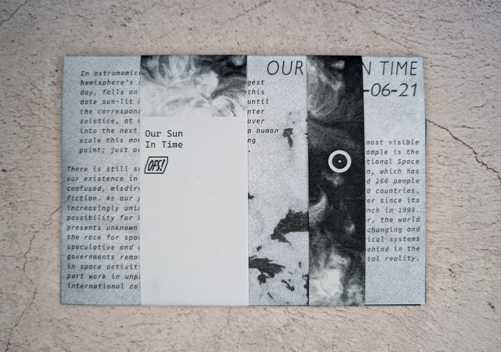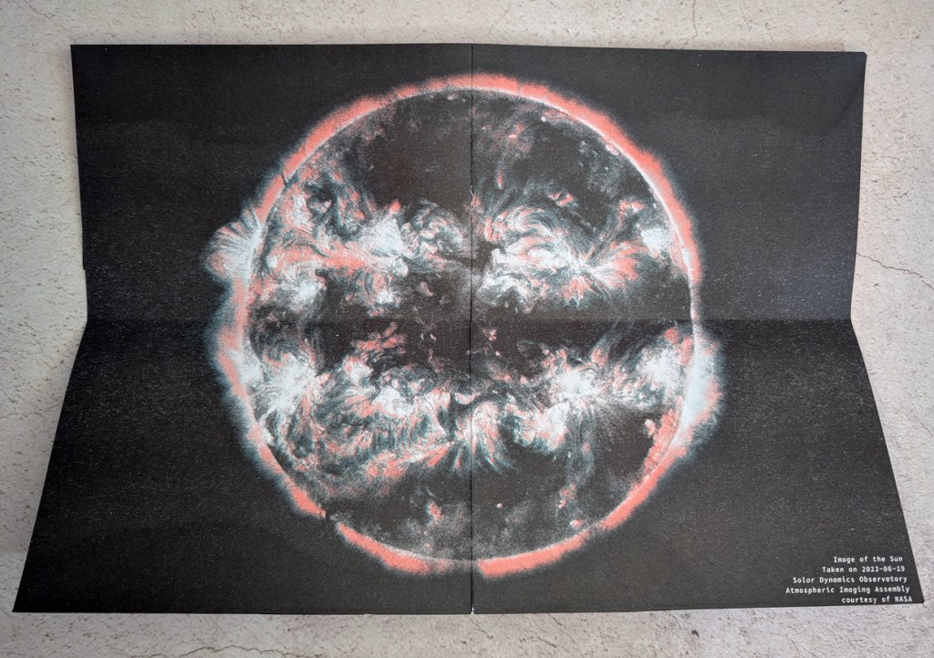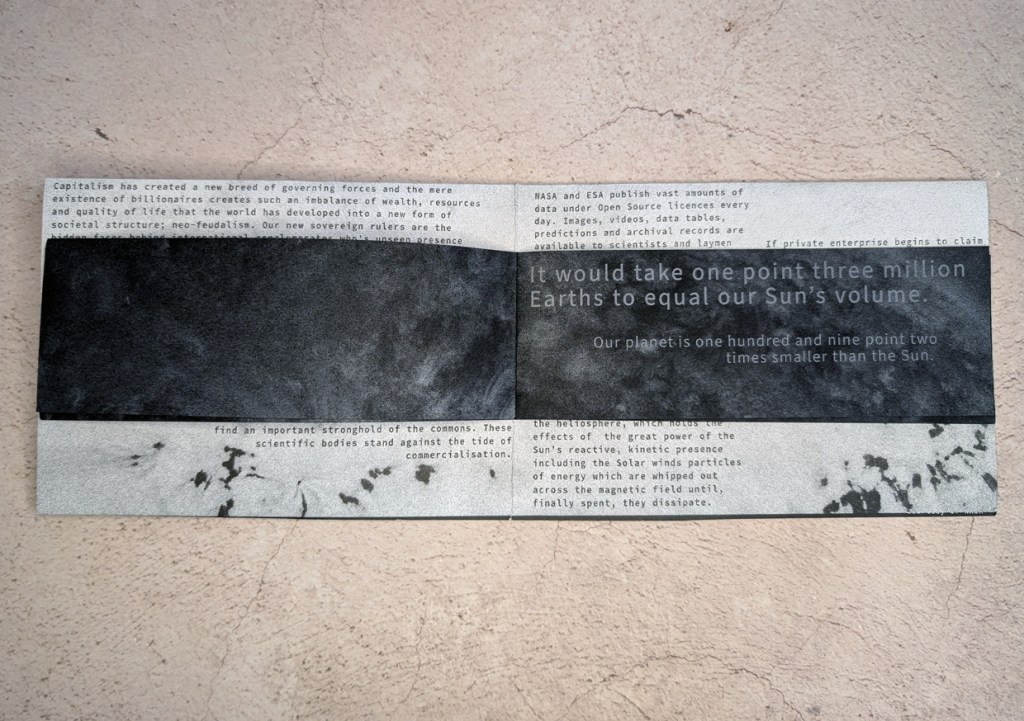 Written and Designed by Morvern Odling. Risograph printed in Metallic Silver, Black, Aqua and Fluro Orange. The image in this book was taken by the Atmospheric Imaging Assembly for the Solar Dynamics Observatory (SDO) on midsummer’s day 2023.